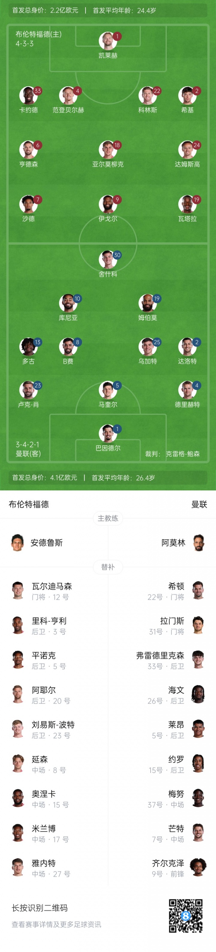 布伦特福德首发:1-凯莱赫、2-希基、4-范登贝尔赫、22-科林斯、33-卡约德、6-亨德森、18-亚尔莫柳克、24-达姆斯高、7-沙德、9-伊戈尔-蒂亚戈、19-瓦塔拉